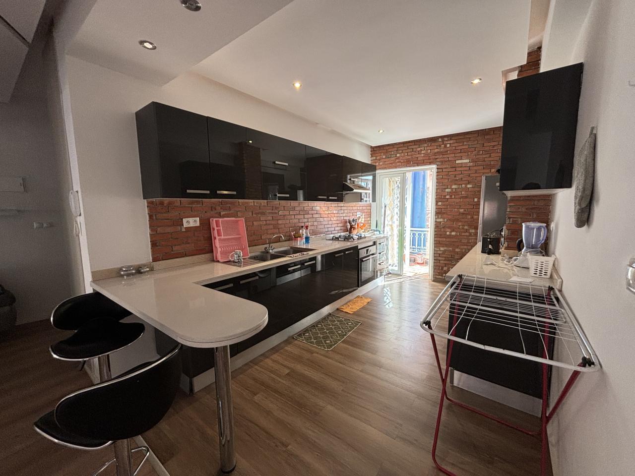 The apartment comprises a large living room with a fully equipped kitchen, two spacious bedrooms, two bathrooms, and a balcony running the length of the apartment from the living room to the bedrooms.