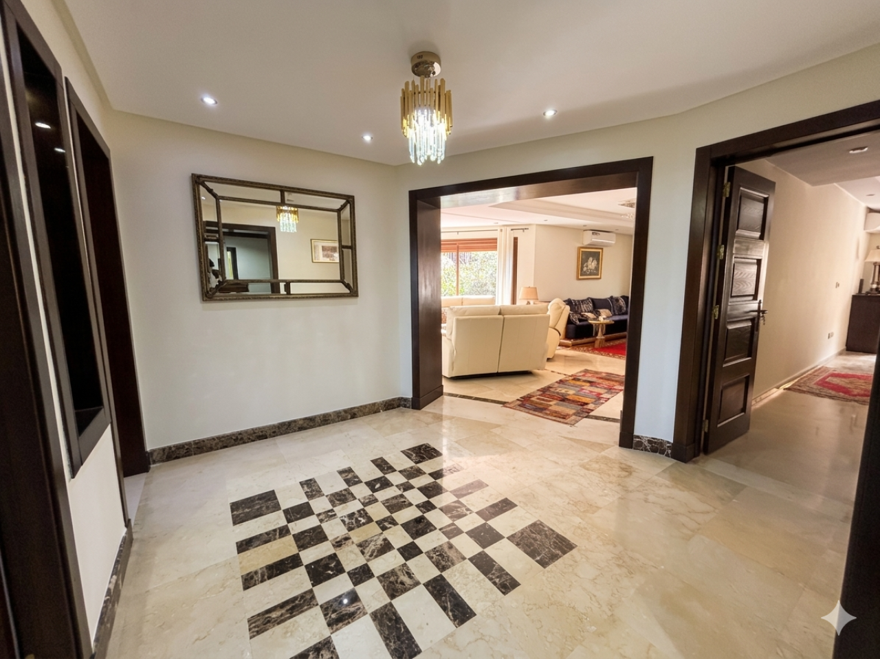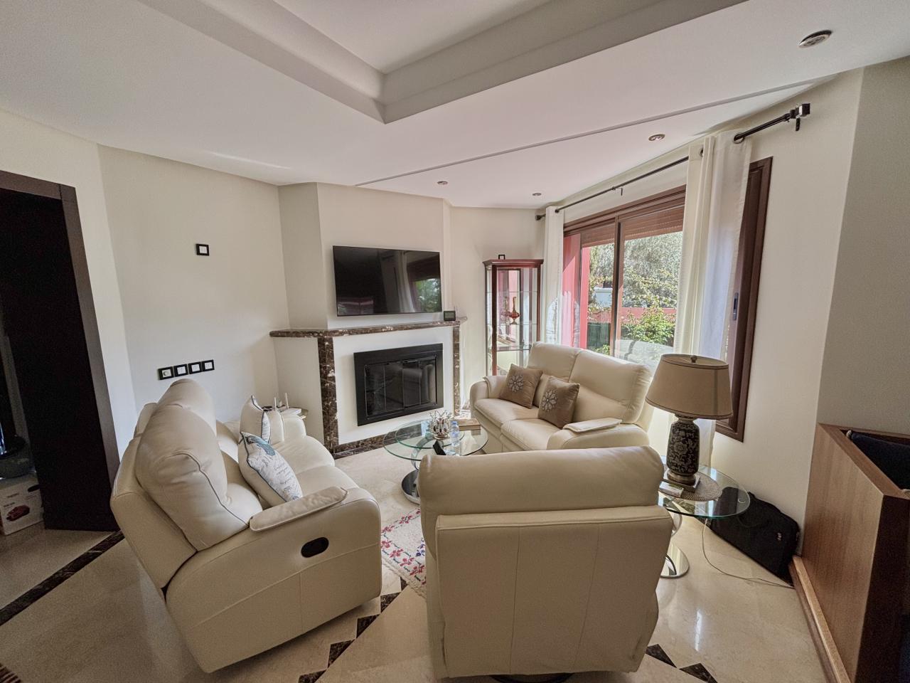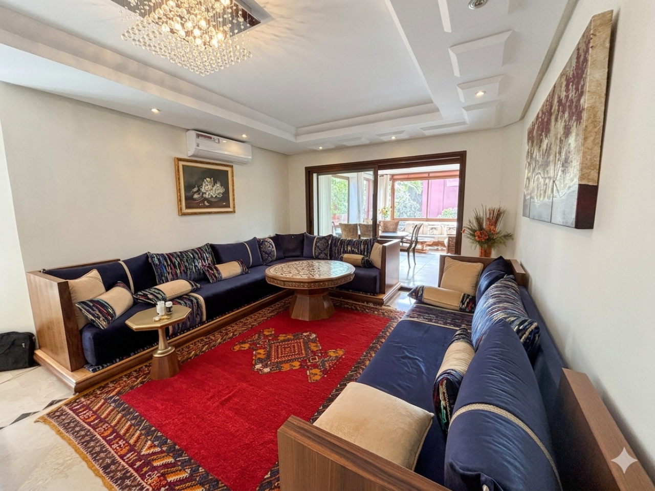 Double living room with TV area, fireplace, and Moroccan-style lounge/reception area