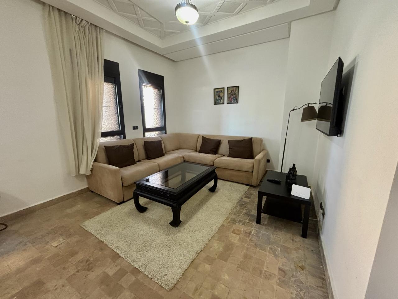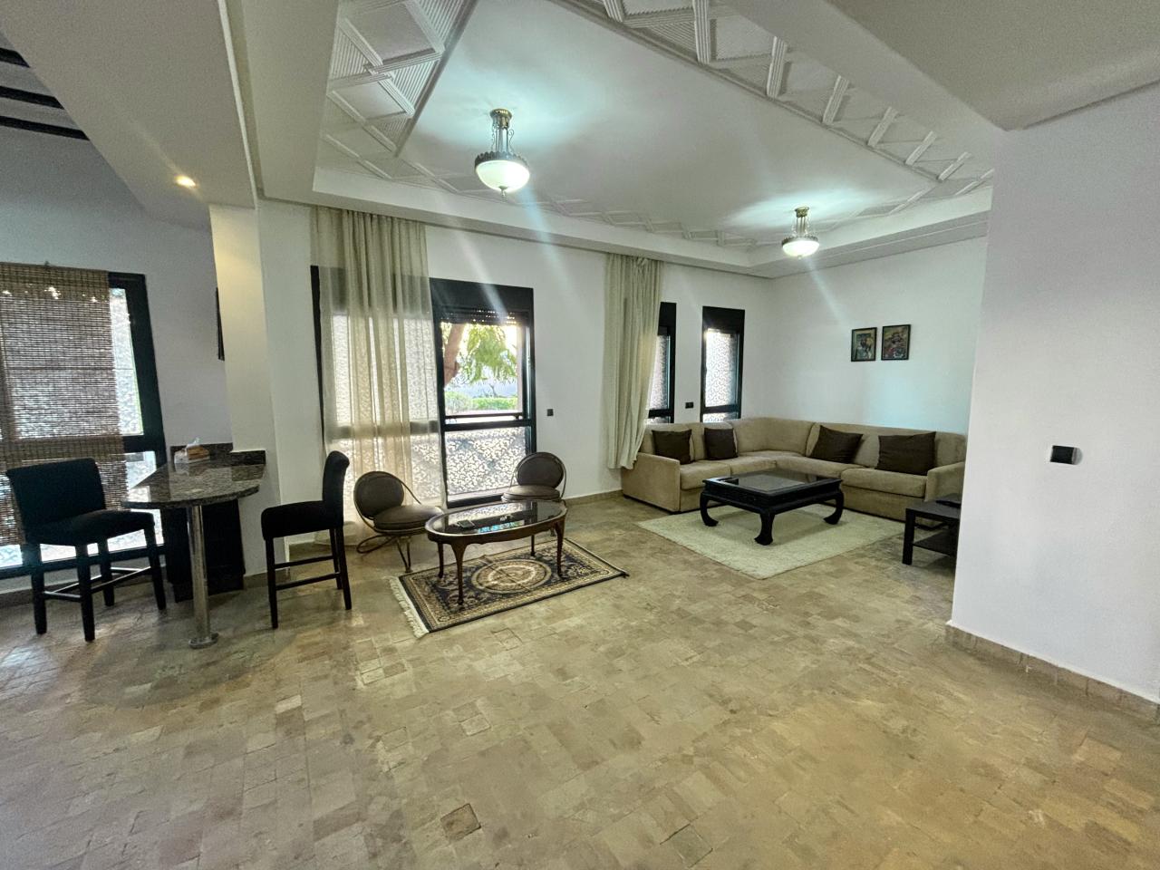 It is located on the ground floor of the first building in the Premium Village residence, situated in the Marrakech palm grove.