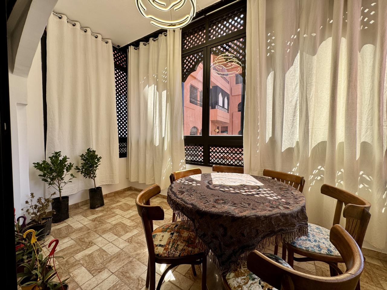 Salon & salle à manger lumineux donnant sur un balcon avec vue sur la Palmeraie