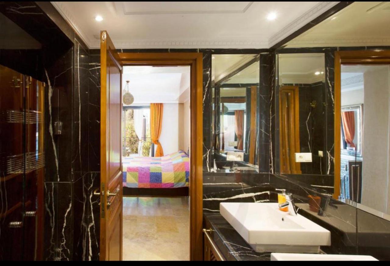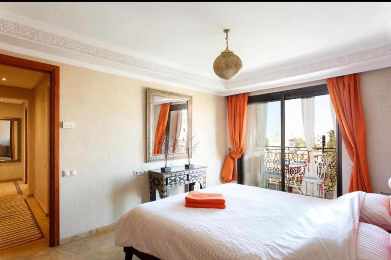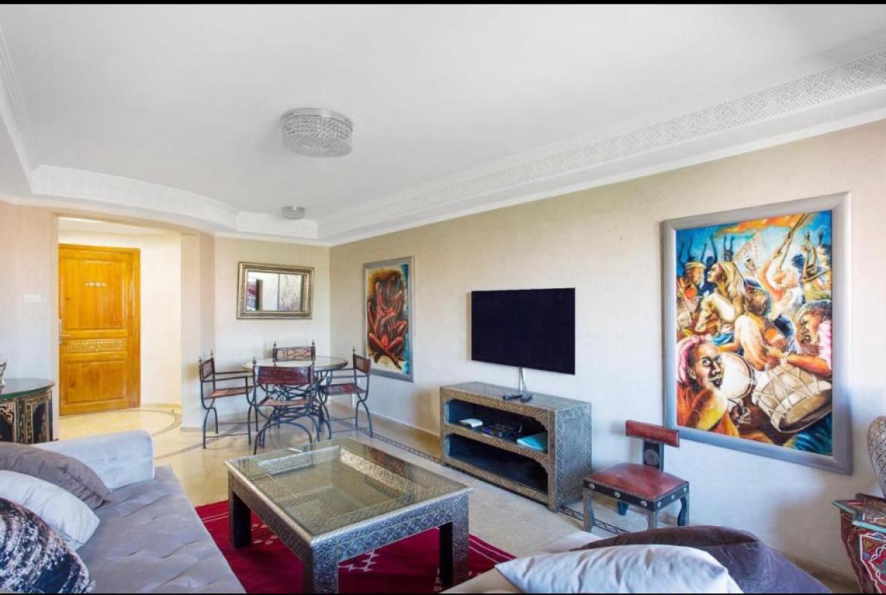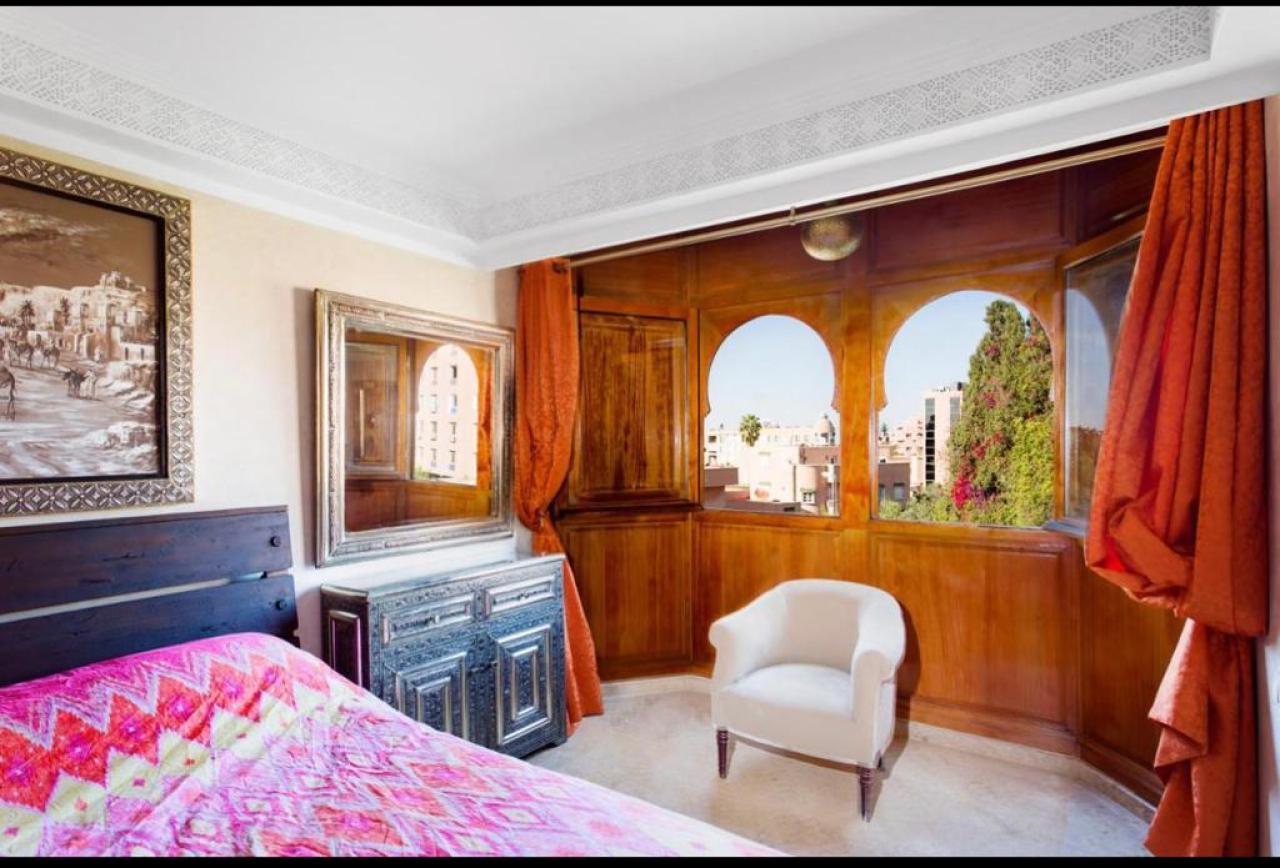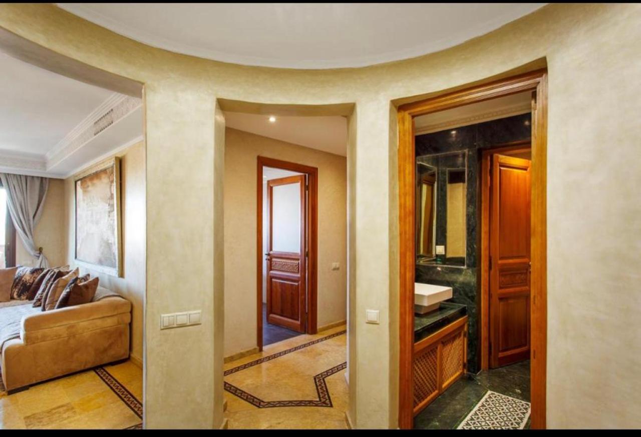 Cet appartement offre un cadre de vie prestigieux et confortable, idéal pour ceux qui recherchent une location à Marrakech Hivernage dans un environnement calme et raffiné.