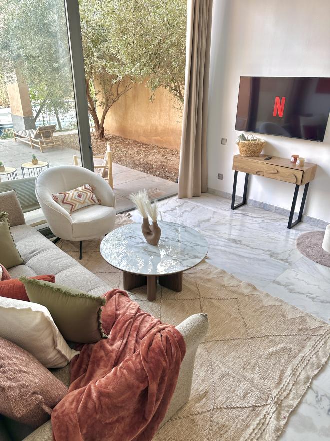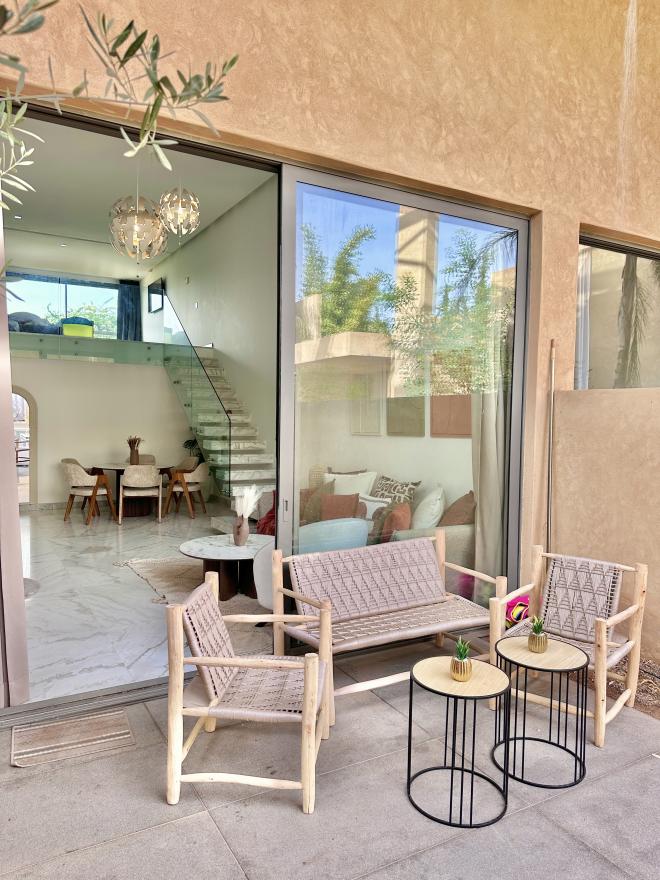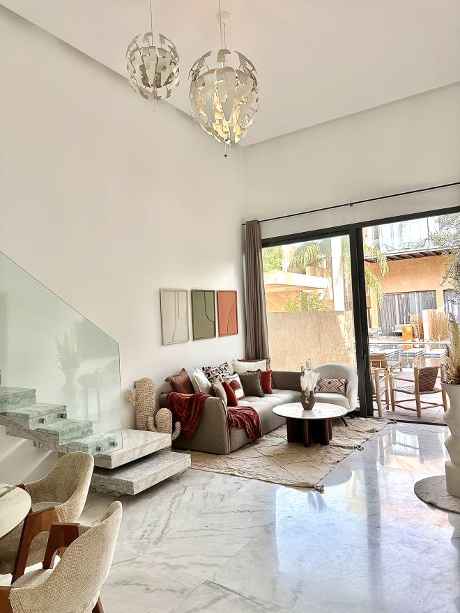 Votre agence immobilière à Marrakech PRESTIGE GALLERY IMMO a le plaisir de vous présenter à la vente ce Superbe duplex de 140 m² situé dans une résidence calme, familiale et sécurisée sur la Route de Ouarzazate (km 6). Un bien rare, lumineux et parfaitement entretenu, idéal pour habitation ou investissement locatif Airbnb à haut rendement.