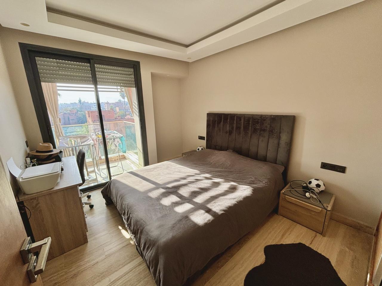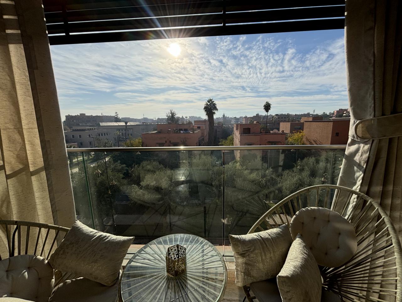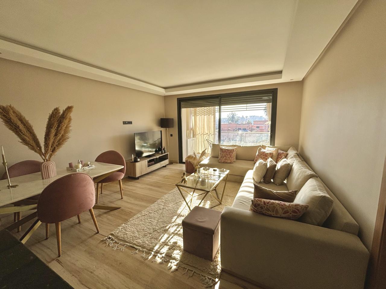 En entrant, on arrive dans la pièce à vivre, composée d’une cuisine américaine d’un coin salle à manger et d’un salon avec espace télé, Suivi du balcon, qui offre une magnifique vue sur la chaîne de l’Atlas.