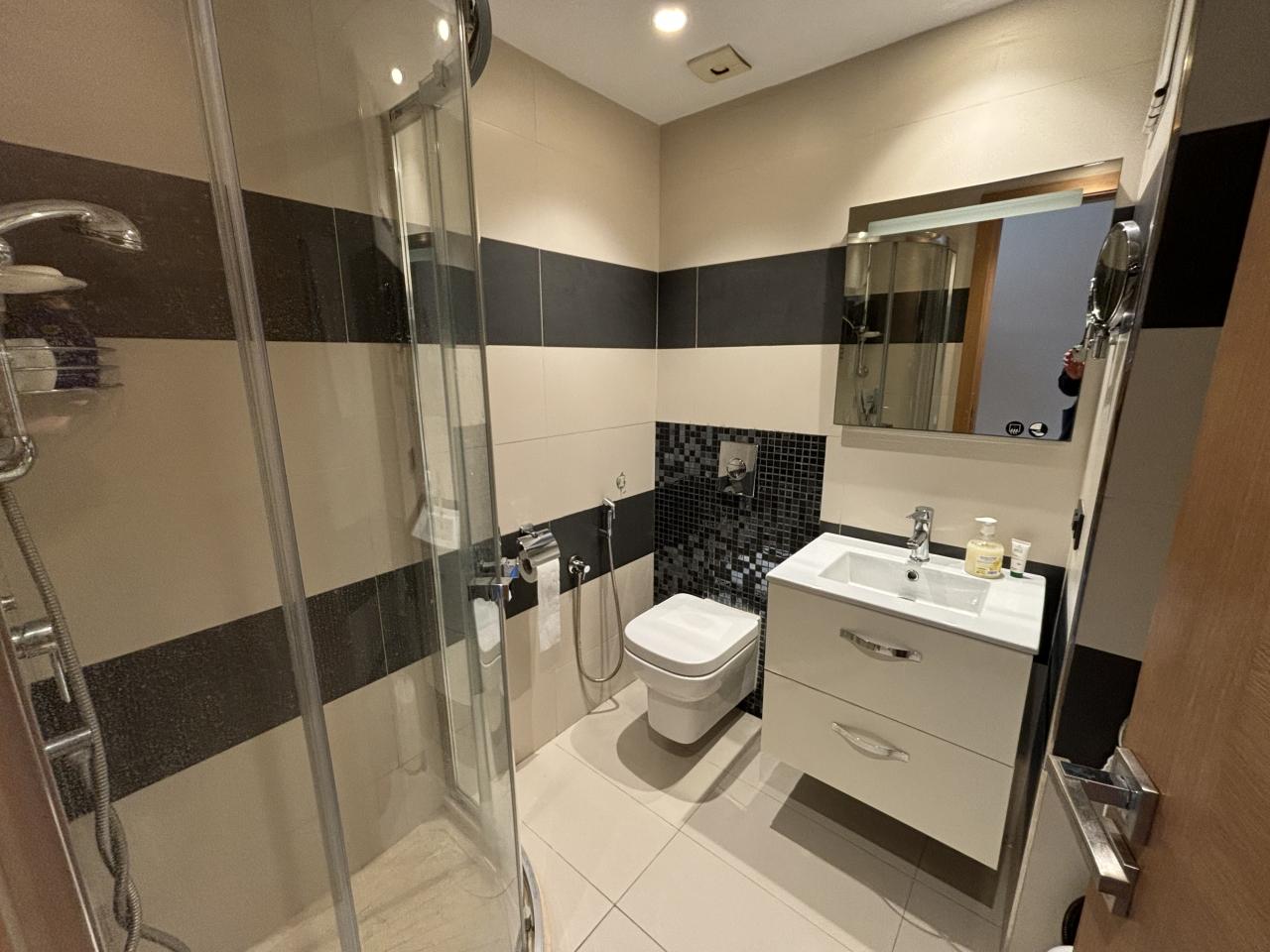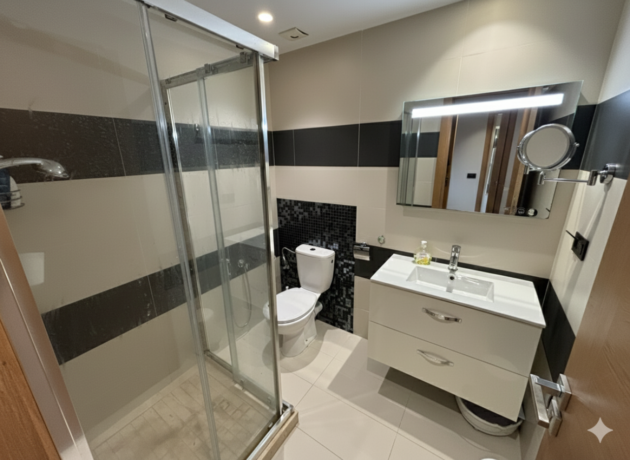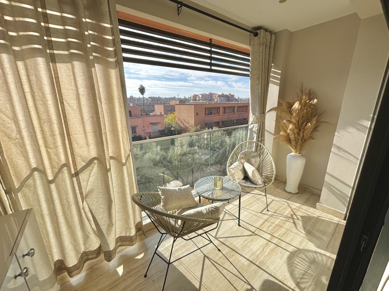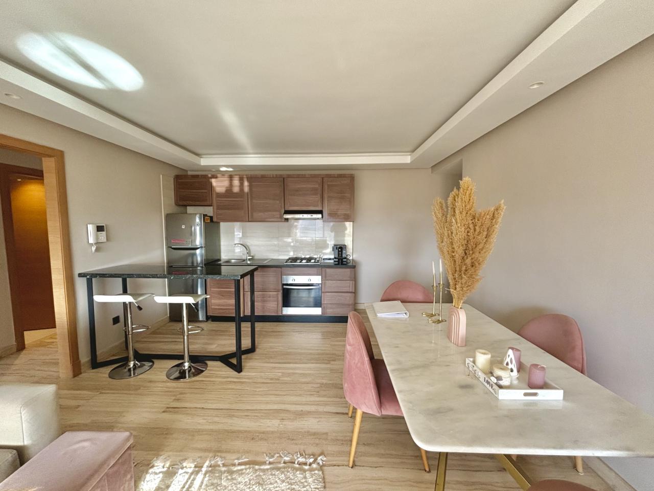 En entrant, on arrive dans la pièce à vivre, composée d’une cuisine américaine d’un coin salle à manger et d’un salon avec espace télé, Suivi du balcon, qui offre une magnifique vue sur la chaîne de l’Atlas.