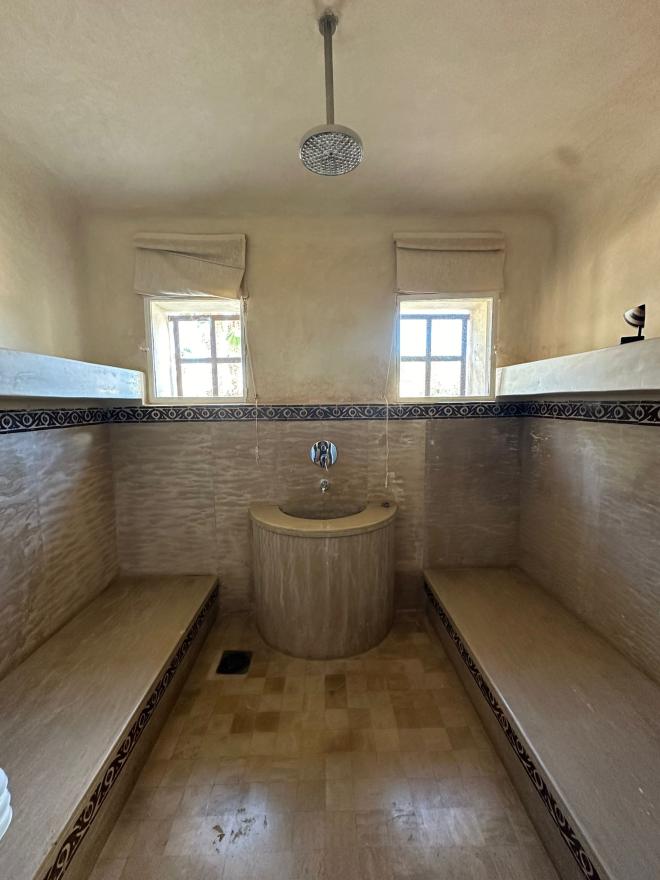 La villa dispose également d’une cuisine entièrement équipée, de deux grandes terrasses couvertes idéales pour les repas et moments de détente, ainsi que d’un hammam traditionnel.