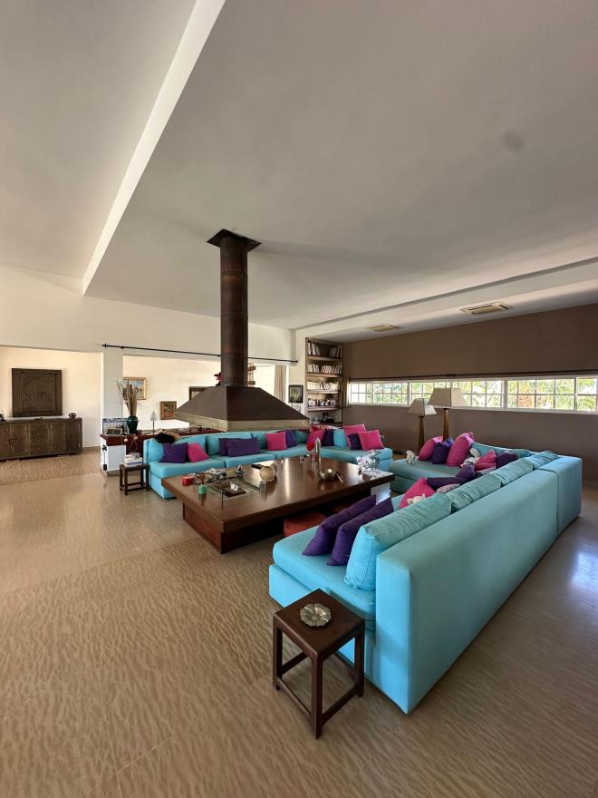 La pièce de vie principale, conviviale et lumineuse, s’étend sur environ 100 m² et est sublimée par une élégante cheminée suspendue, créant une atmosphère chaleureuse et raffinée.