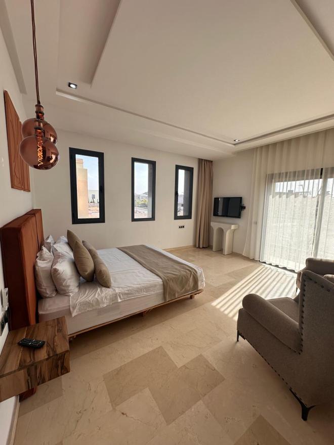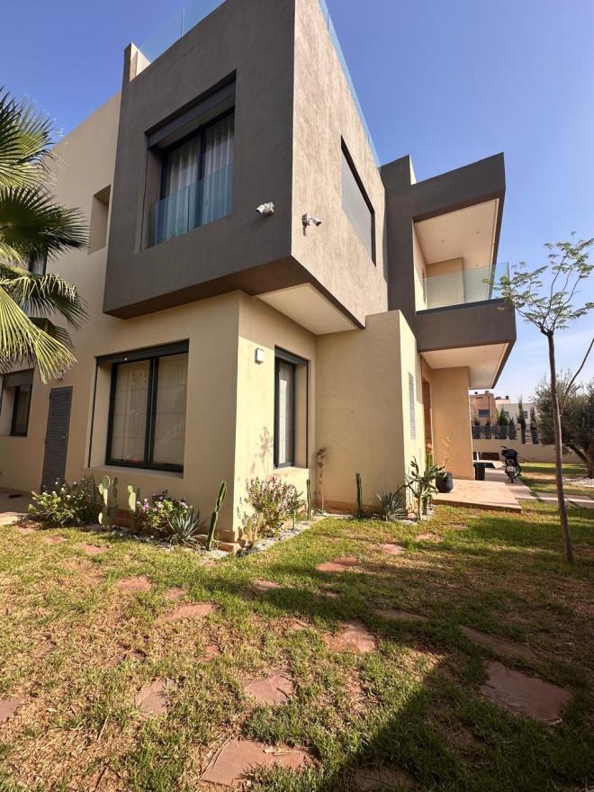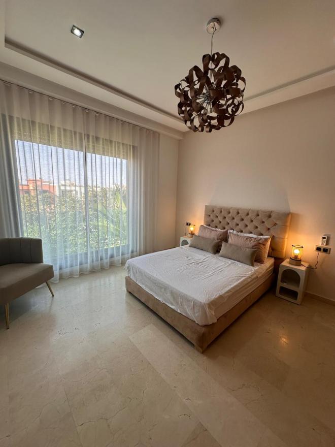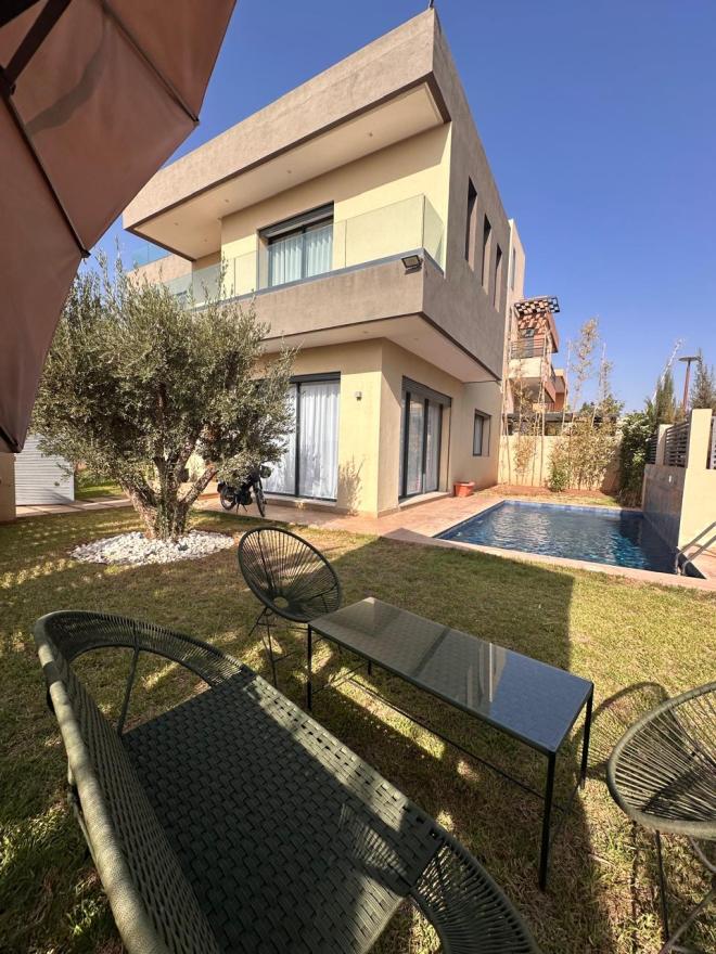 Votre agence immobilière PRESTIGE GALLERY IMMO a le plaisir de vous proposer une belle villa meublée à taille humaine à louer, idéalement située sur la Route de Tahanaoute, au sein d’une résidence sécurisée et golfique, à seulement 15 minutes du centre-ville de Marrakech, dans le secteur recherché de Noria Golf.