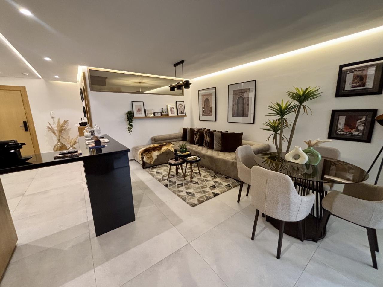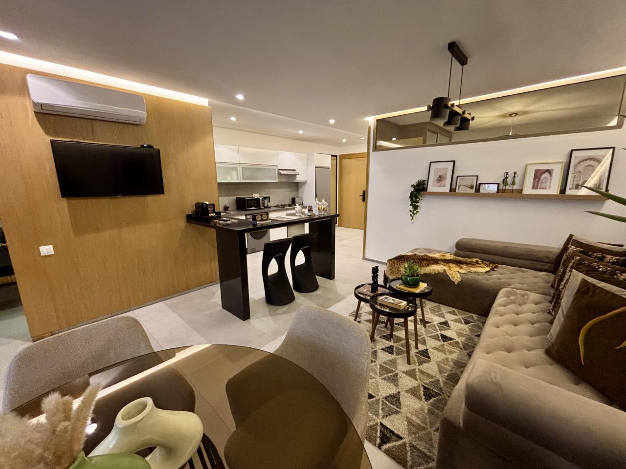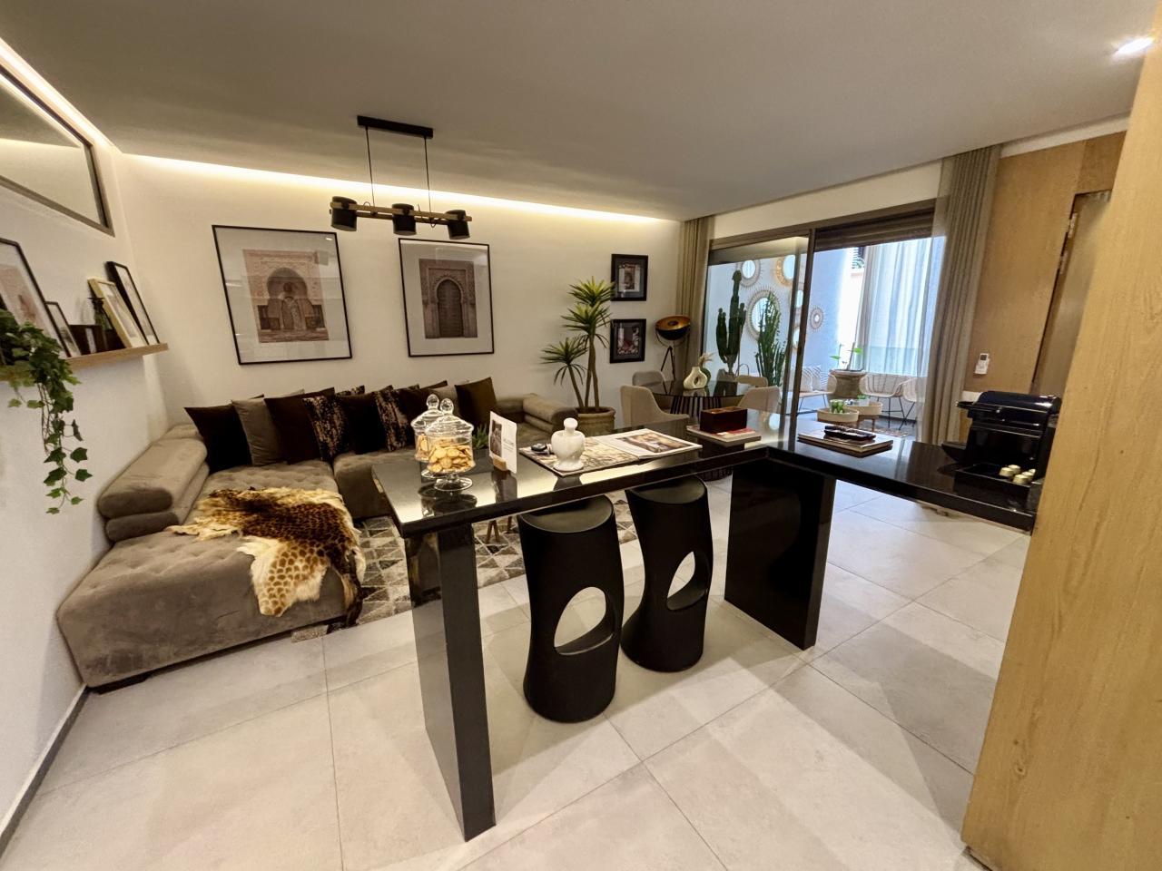 Prestige Gallery Immo, à le plaisir de vous présenter à la location ce magnifique appartement de deux chambres, une salle de bain dans une résidence toute neuve, située dans le quartier de Guéliz vers le McDo, route de Casa.