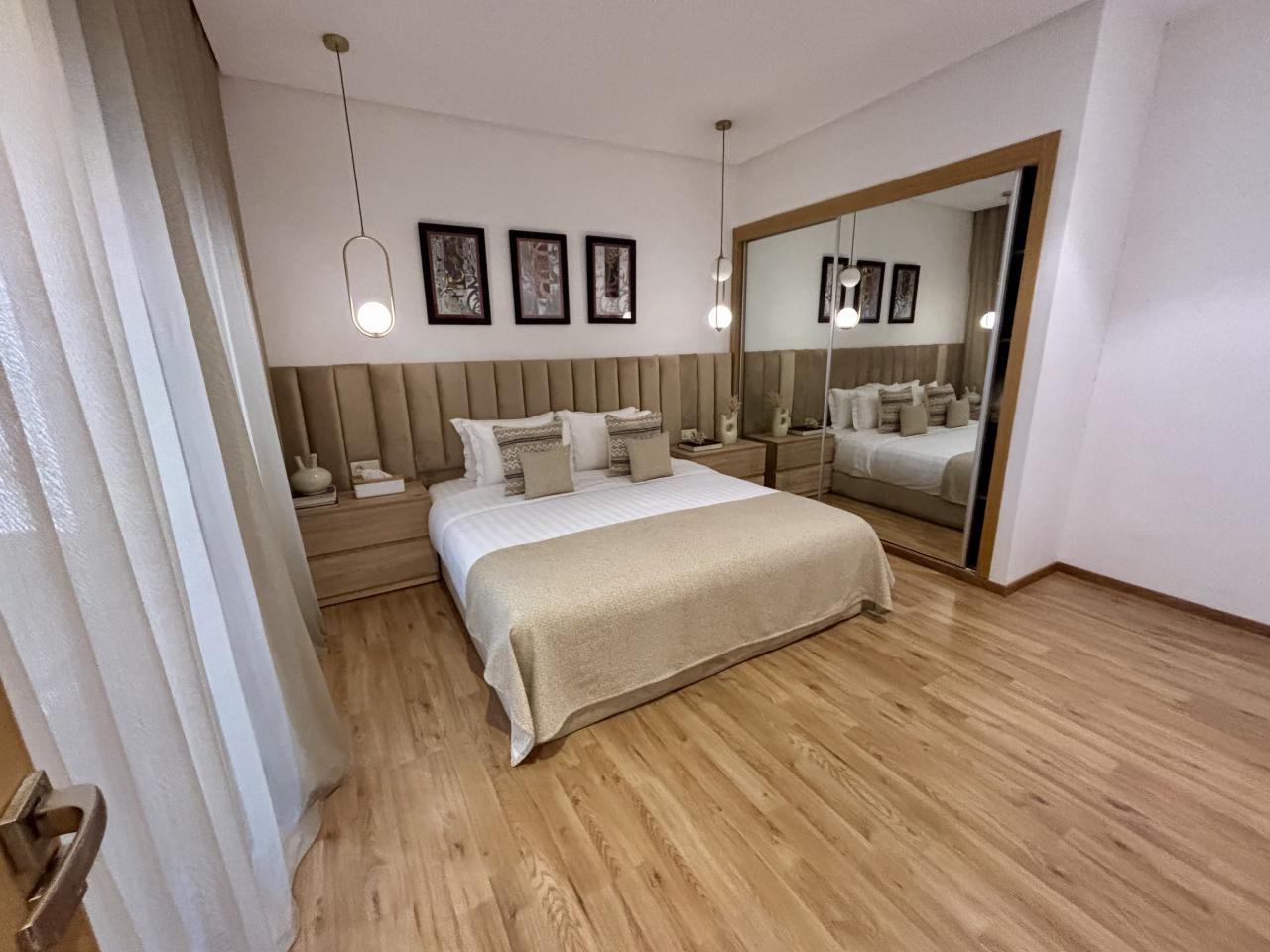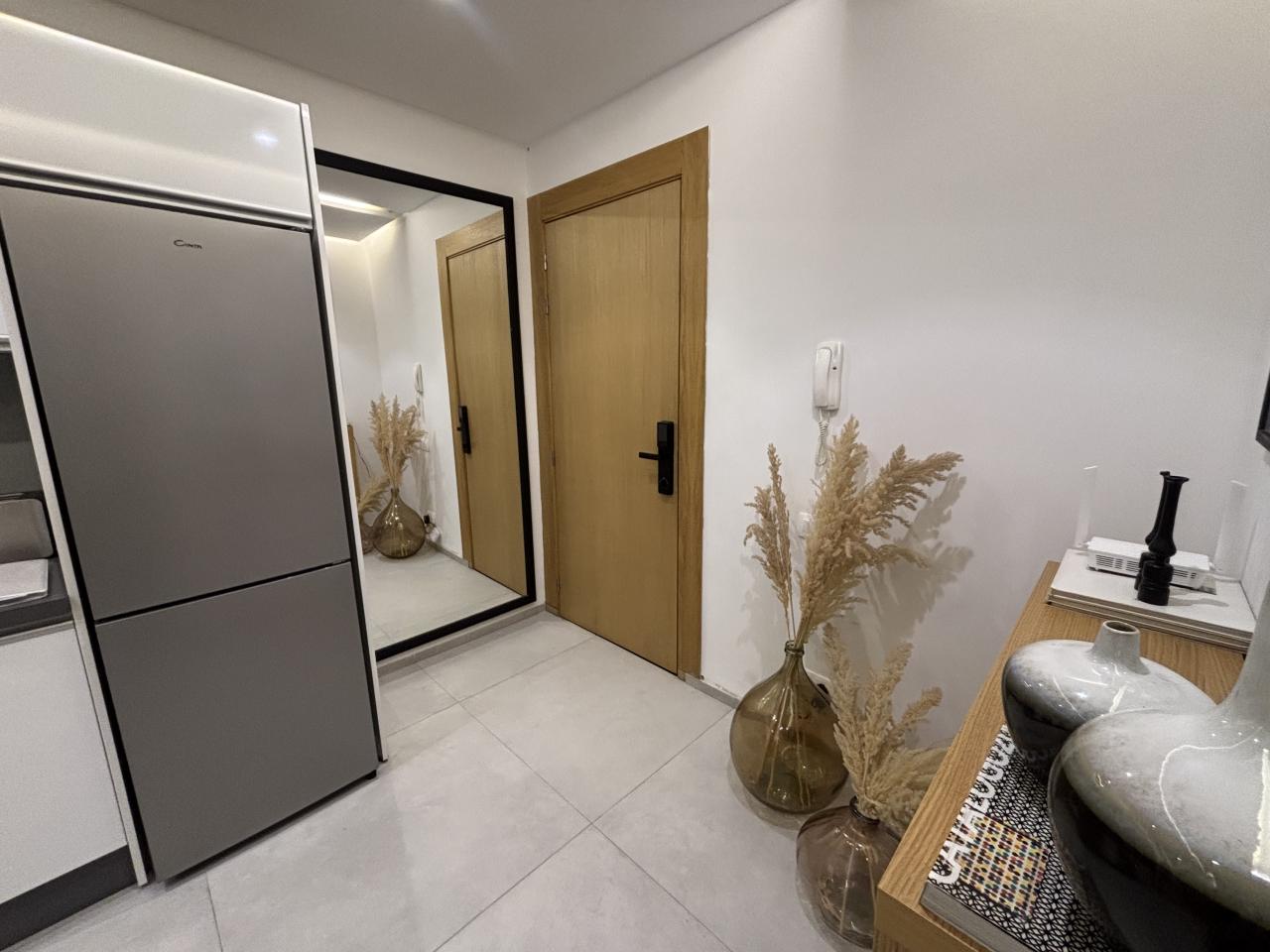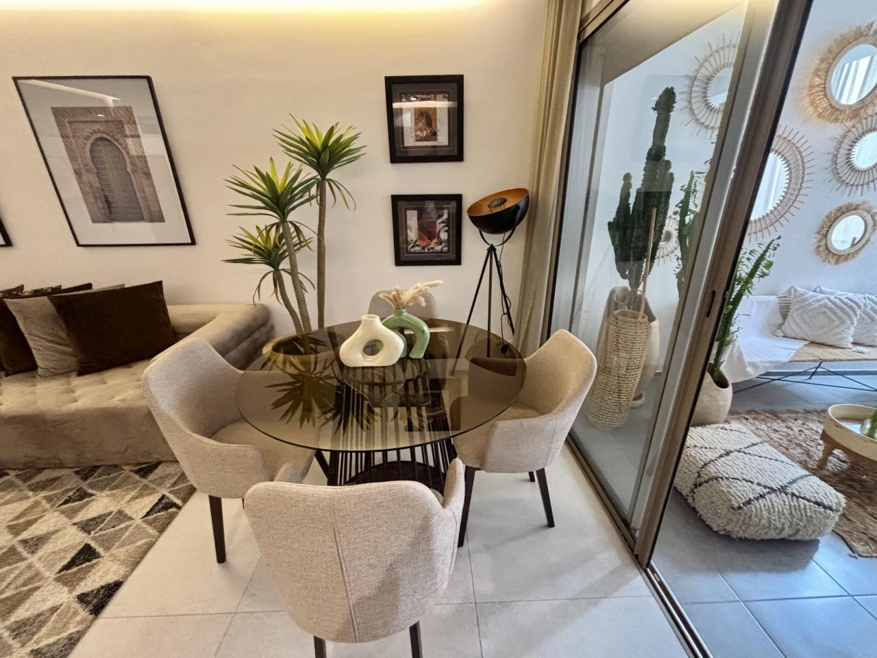 Prestige Gallery Immo, à le plaisir de vous présenter à la location ce magnifique appartement de deux chambres, une salle de bain dans une résidence toute neuve, située dans le quartier de Guéliz vers le McDo, route de Casa.